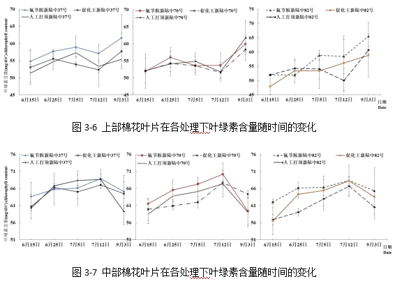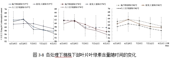 新陸中37號(hào)與新陸中70號(hào),噴施促化王打頂?shù)拿藁ㄏ虏咳~片葉綠素含量高于其他兩種打頂方式下的棉花;而新陸中82號(hào),則是使用氟節(jié)胺打頂?shù)拿藁ㄏ虏咳~片葉綠素含量高于其他兩種打頂方式處理下的棉花。