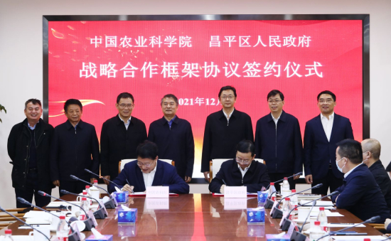 12月1日,中國農(nóng)業(yè)科學(xué)院與北京市昌平區(qū)人民政府舉行共建國家未來農(nóng)業(yè)中心戰(zhàn)略合作框架協(xié)議簽約儀式。農(nóng)業(yè)農(nóng)村部黨組成員、中國農(nóng)科院院長吳孔明,院黨組書記張合成,副院長王漢中、劉現(xiàn)武,昌平區(qū)委書記甘靖中,區(qū)委副書記、代區(qū)長支現(xiàn)偉,副區(qū)長楊仁全、郭清堯參加活動。劉現(xiàn)武和楊仁全代表雙方在協(xié)議上簽字。